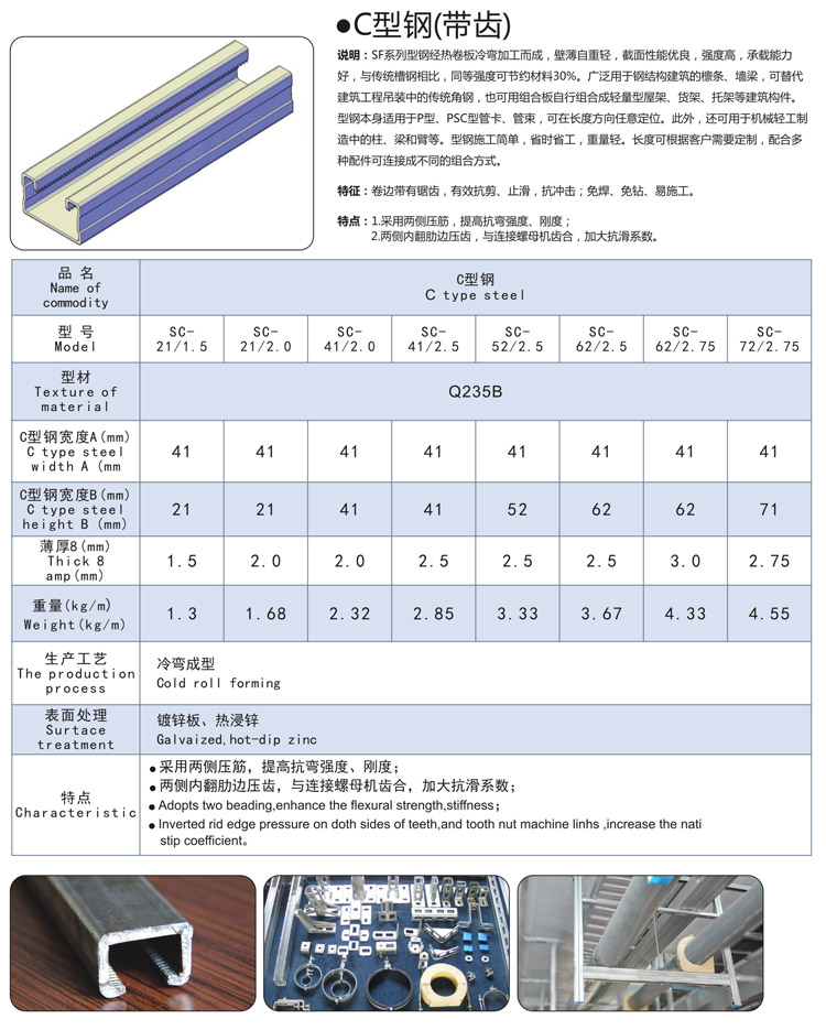 说明:SF系列型钢经热卷板冷弯加工而成,壁薄自重轻,截面性能优良,强度高,承载能力好,与传统槽钢相比,同等强度可节约材料30%。广泛用于钢结构建筑的檩条、墙梁,可替代建筑工程吊装中的传统角钢,也可用组合板自行组合成轻量型屋架、货架、托架等建筑构件。型钢本身适用于P型、PSC型管卡、管束,可在长度方向任意定位。此外,还可用于机械轻工制造中的柱、梁和臂等。型钢施工简单,省时省工,重量轻。不同长度客户需要定制,配合多种配件可连接成不同的组合方式。